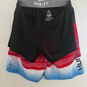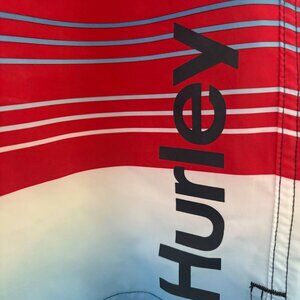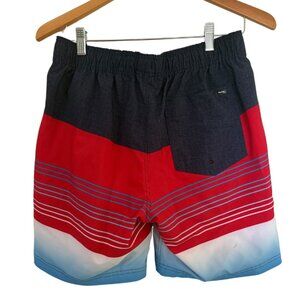 Dive into style with Hurley's vibrant striped swim shorts. Featuring a striking dark blue, red and light blue design.
