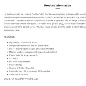Hurley Pro 23” Compression Surf Tights Shorts Grey Mens Size S 50+ UPF JJF