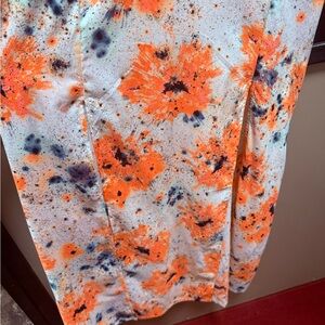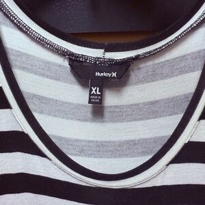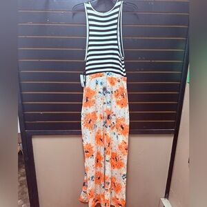 Brand new with tags Hurley Simone maxi dress in size XL. Features a black-and-white striped sleeveless racerback bodice and a vibrant orange floral splatter skirt. Soft, stretchy knit fabric for all-day comfort.