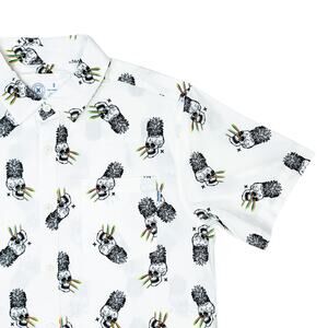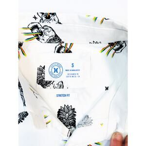 Stand out in style with this Hurley Skull Print short sleeve button-up shirt. Features an all-over black skull graphic with subtle rainbow accents on a crisp white background. Made from a comfortable cotton-spandex blend (98% cotton, 2% spandex) for a breathable and flexible fit. Men’s size Small with measurements: pit-to-pit 22”, length 30”, sleeve 9”. New with tags (NWT).
