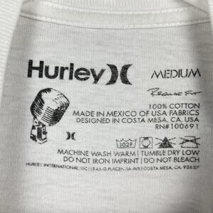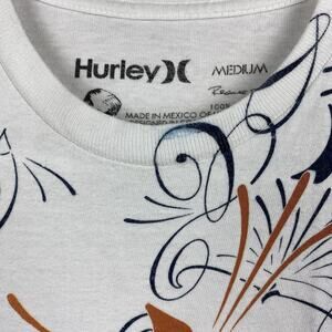 Hurley short sleeve t-shirt in white, size Medium. Features a bold navy/orange swirl graphic with Hurley logo at center. Regular fit, 100% cotton fabric. Made in Mexico of USA fabrics, designed in Costa Mesa, CA.