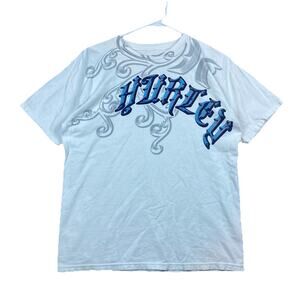Hurley short sleeve t-shirt in white, size Medium. Features bold gothic-style blue “Hurley” logo across the chest with gray swirl detailing. Regular fit, soft 100% cotton fabric. Made in Mexico of USA fabrics.