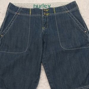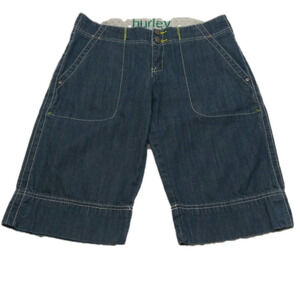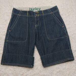 Hurley Women's Vintage Chambray Low/Mid Rise Bermuda Shorts. 100% Cotton. Two Button/Zipper Front Closure. Stitch Detail Side Front Pockets. Functional Stitch Seam Detail Back Pockets. Measurements approx. Flat Lay. Waist: 14.5, Rise: 8, Hips: 19, Inseam: 13.5, Hem Opening: 8.5 Size 5. Color May Vary Due To Lighting.