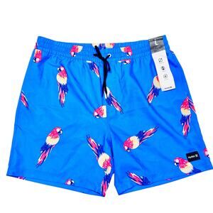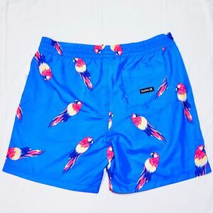 Introducing Hurley Windansea swim trunks in men’s large, in blue with parrot all-over print. These 17" long stretch swim shorts feature quick-dry fabric, an adjustable drawstring waist, and lightweight construction. The item is new with tags.