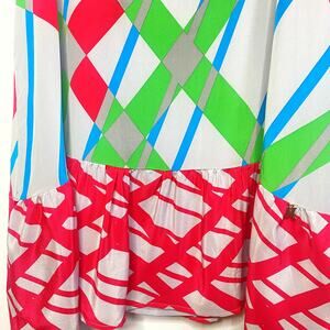 100% silk, fully lined sun dress. Shoulder strap tie closure, dropped waist with gathered bottom ruffle. Bright colored green, red, blue on a slate gray background. Lightweight.