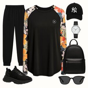 Sporty Streetwear – Joggers, chunky white sneakers, cap, structured backpack.