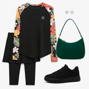 Hurley Women’s XXL Rash Guard Surf Shirt – Black w/ Tropical Floral Sleeves