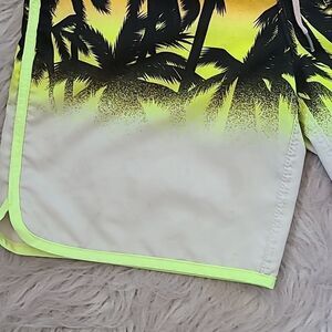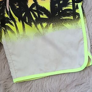 Hurley boys black, yellow and gray tropical board shirts size 26, gray area has stains and tie on waist is discolored