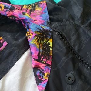 Super lightweight with black and gray subtle camo print. Lined at collar and inside of hood with a tropical sunset print. Hood detaches with snaps as well. Love this jacket but have too many!