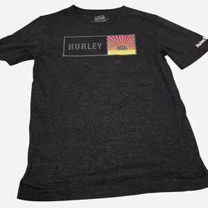 Hurley bundle 🌊 Pink–orange–yellow ombré swim trunks (M) + dark gray Hurley tee (L) with bold sunset spell-out graphic. Easy beach-to-street fit — summer vibes in one grab.