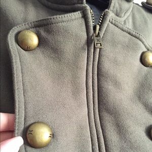 Fiercely chic Hurley olive green peacoat jersey jacket. Great Hurley quality and detail. Size M, NWOT! In excellent condition. Looks great on, too bad it does not fit anymore. Great with jeans and high knee boots! 20”bust, shoulder 16”, length 26.5”