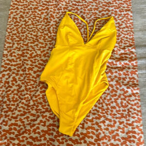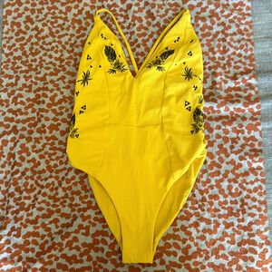Hurley quick dry ribbed yellow and black embroidered one piece swimsuit.