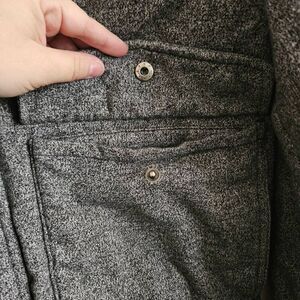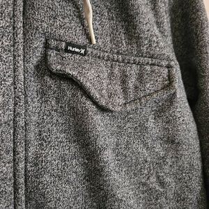 This is a grey hooded jacket by Hurley. It has a zipper that can be covered by a snap button panel. On the front of the jacket are three pockets with snap closures. At the neckline collar is a drawstring.