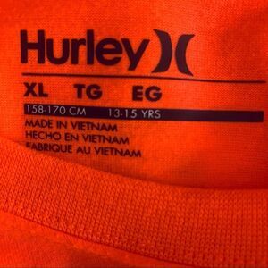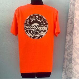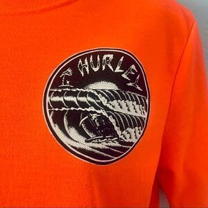 Cute neon orange Hurley graphic tee. Crew neck. Small stain on front lower as shown in last photo. No other flaws. Hurley. Size XL