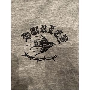 Grey with black graphic on front and back. 20” pit to pit.