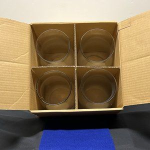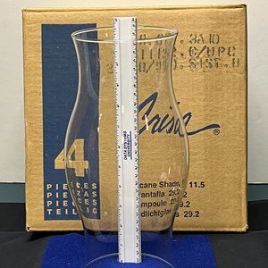 11.5” tall vertical design 4.5” wide opening with soft curves and side walls to keep candles lit made of quality glass construction is easy to clean offering brilliance and clarity. Box of (4) in original box from Crisa Glassware factory. 2 boxes available priced separately = 8 lamp shades.