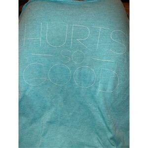Teal racer back tank with raw surged edges light writing on front “Hurts So Good”. Size XL.