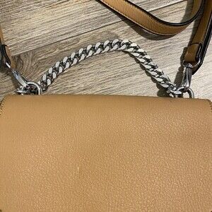 Huser Crossbody Purse Tan Vegan Faux Leather Chain Strap. Excellent like new condition. Has a removable crossbody strap. Inner pockets.