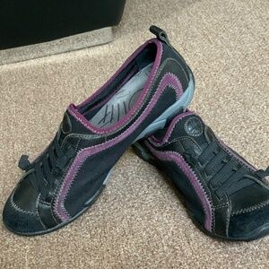 Hush puppies sneaker shoe in black leather/suede with some purple color detail. Very comfy. Good condition. Size 37