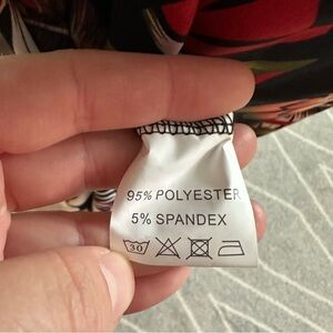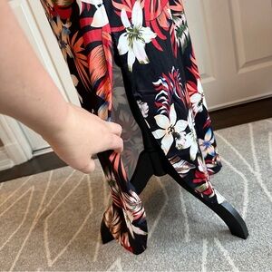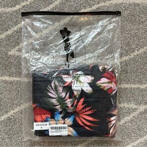 Very pretty, soft and stretchy tropical Hawaiian print dress by Huskary. It has a pretty orange and blue tropical floral print on black background. The hem is a split rounded hem and the side seams have hidden pockets. It had a beautiful mumu style fit with a pretty tucked pleat in the back. Never worn in bag. Only opened to photograph and measure. 17” pit to pit unstretched, 52” total length.