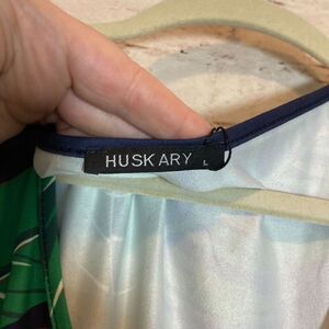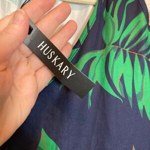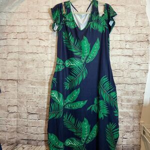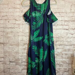 Huskary Maxi Dress Womens Large Navy Tropical Jungle Cold Shoulder Long Pockets