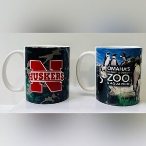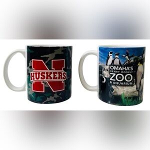 Set of two mugs featuring Huskers and Omaha's Zoo designs. One with camouflage and red accents, the other with a penguin theme.