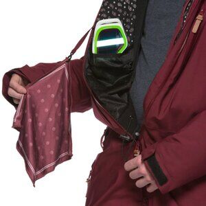 Comes with a microfiber cloth for cleaning lenses, interior pocket for goggles, a removable Sherpa neckliner, and a removable insulated hood. Lycra wrist cuffs to keep out the snow, plus an elastic cord and clip to attach gloves. Underarm, thigh vents and expanding legs to fit over boots.