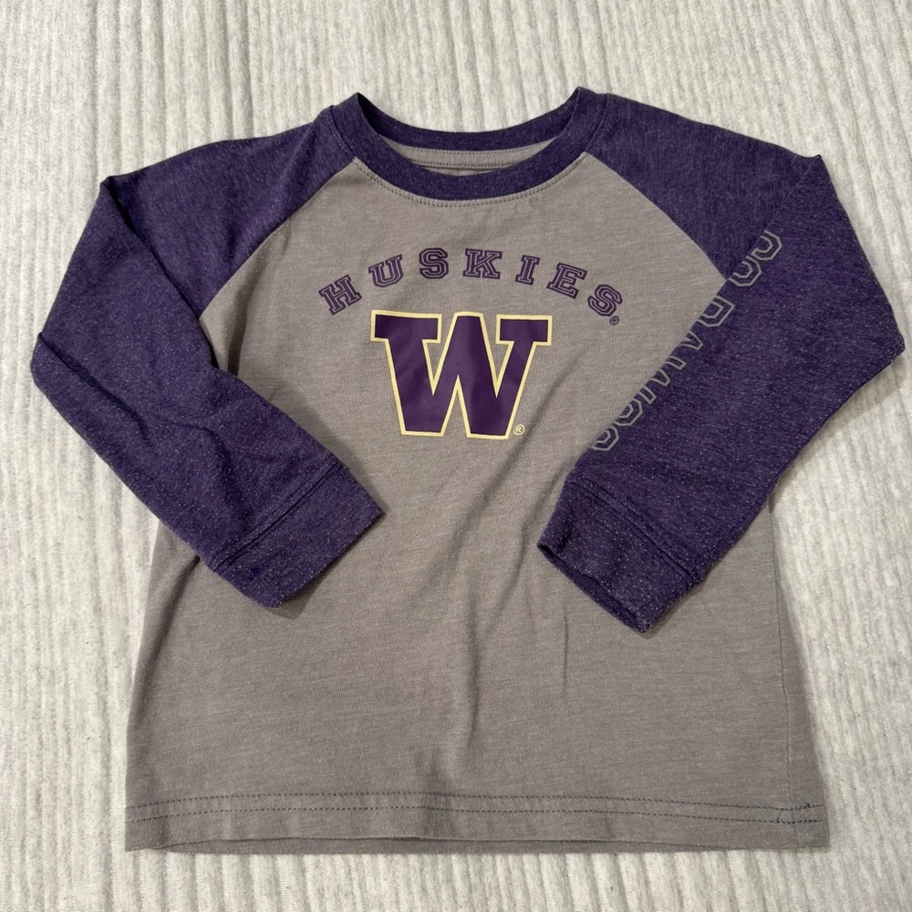Great condition with some pilling on arms. Comfy, soft, lightweight raglan tee in the traditional U-Dub gray and purple. Size 3T.