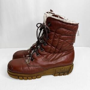 Red / brown boots are a medium-short length (7" from floor to top) with a small platform heel. Sherpa style interior. Exterior features quilted detail and Bastien embossed on the side. Soles are a tan color. Lace up closure. Style is Husky. Vintage 1970s. Made in Canada.