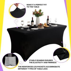 Stretch spandex material and pockets for legs are designed for keeping the tablecloth securely in place to fit your table better and make a flat & professional look so that your table cover won't slip around or billow with wind