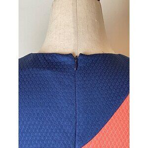 This dress by Hutch for Anthropologie is in excellent condition. It is in an allover colorblocked pattern in blue, orange and purple. The dress features: mini length, jersey knit fabric with stretch, crew neckline, sleeveless, lined, fit and flare silhouette and back zip closure. It is made from a polyester and spandex blend.