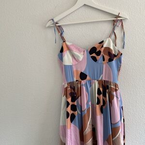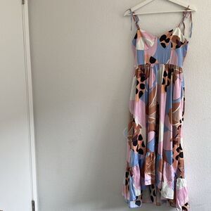 Details: self-tie shoulder straps, shirred waist, dual side seam pockets and shirred high-low hem Center back zipper with hook-and-eye closure, cheetah print, polka dot