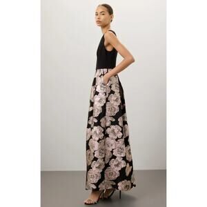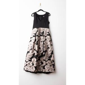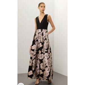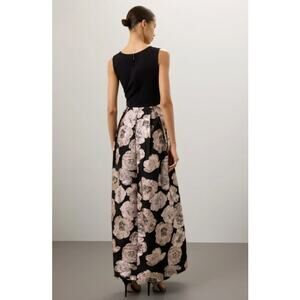 Black floral printed jacquard (62% Polyester, 26% Cotton, 12% Metallic). Gown. Sleeveless. V-neckline. Center back zipper with hook-and-eye closure. Fully lined. Side pockets.