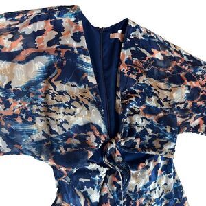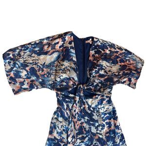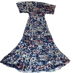 For sale is this Hutch Chiara Blue Multicolor Printed Tie Front Cut Out Maxi Dress Size Small. This flowy dress is in good condition and features short sleeves, back zipper closure, v-neckline, and is partially lined.