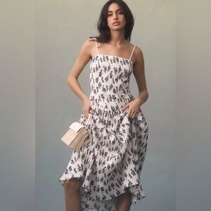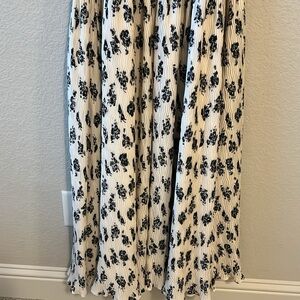 Elegant white dress with a black floral print. Perfect for any occasion. Floral printed midi dress in plisse fabrication. Adjustable straps. Pullover styling. Runs large so size down. Gently used condition.