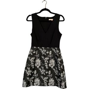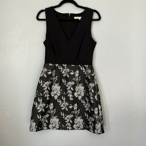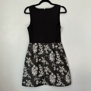V-neck dress, black bodice with flattering darts under bust line, sleeveless, silver floral print on flare skirt, sits at natural waist, falls just above knee. Hidden back zipper