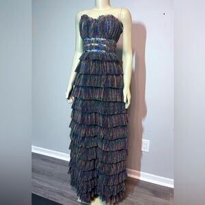 Features: Strapless design, multi-layered tiered tulle, vibrant textured colors, unique, Modaba exclusive samples produced by Hutch, only few samples ever made.