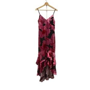 New with tags Hutch floral ruffle high-low dress in crushed velvet with a pink flower pattern.