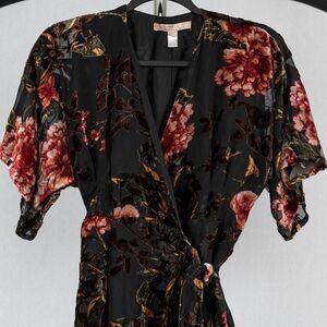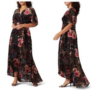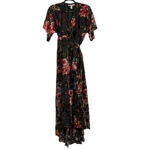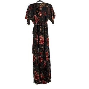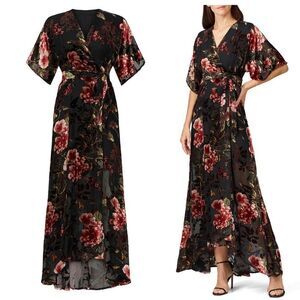 Black floral printed velvet (Viscose, Nylon). Gown. Short sleeves. V-neckline. True wrap closure. Fully lined. See size and fit tab for lengths.