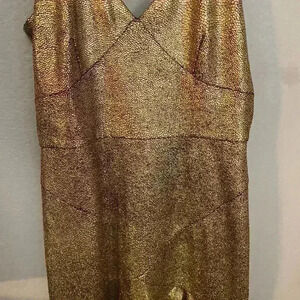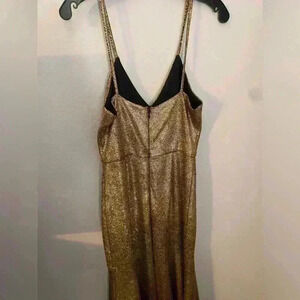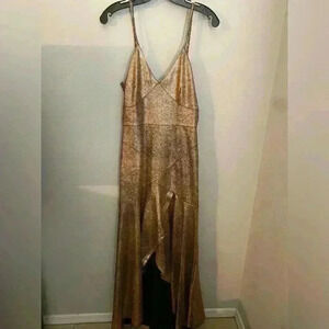 Elegant high low dress by Hutch. Features a shimmering gold hue. Perfect for special occasions.