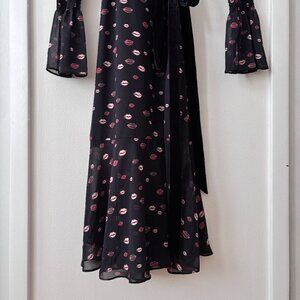 The truth is you will be falling head over heels for this ultra-feminine black midi dress by Hutch. Why, you ask? For starters, the smocking at the sheer, long sleeves that are adorned with ruffle cuffs are details that are worth falling hard for. Secondly, this lined wrap dress is made from a smooth, flowy chiffon that boasts an all over, quirky-cute pink and red hued lip print that is just asking for love and admiration. To add to these irresistible details are the chic surplice neckline, adjustable black velvet tie-belt at the wrap-front waist, and its sleek, curve-skimming silhouette.