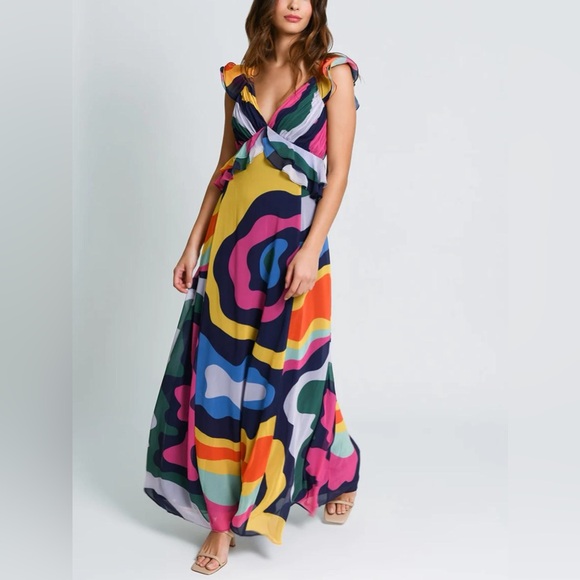 A vibrant maxi dress showcasing an abstract floral print. This dress features flutter sleeves, a deep V-neckline with ruffle detailing cascading down the bodice, and an A-Line skirt.