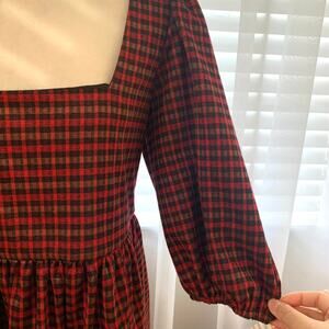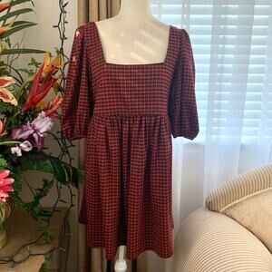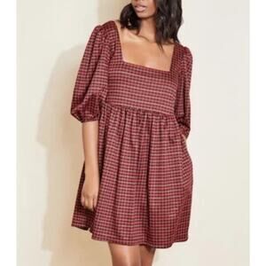NWT Hutch Square Neck Puff Sleeve Checker Plaid Mini Dress in Red Multi