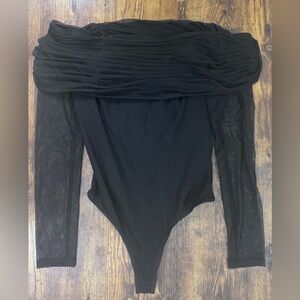 Who doesn't love a good bodysuit?Introducing the Hutch Thatcher Bodysuit, an elegant piece perfect for summer dinner parties. This design features long sleeves and an off-the-shoulder neckline, crafted from luxurious stretch mesh fabric. With a length of 22 inches from HPS and a convenient pull-on closure, it delivers a sleek, solid black silhouette.
