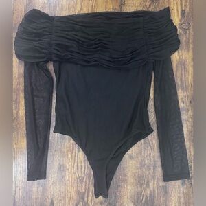 Hutch bodysuit, Hutch Thatcher bodysuit, black off shoulder top, off the shoulder bodysuit, mesh detail bodysuit, long sleeve bodysuit, chic black top, night out bodysuit, date night top, cocktail outfit top, small bodysuit, Hutch clothing, women’s bodysuit