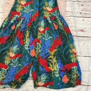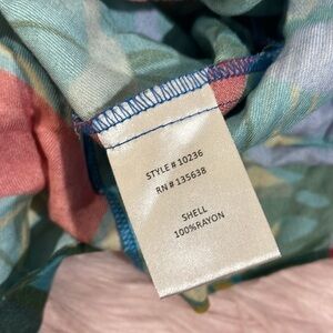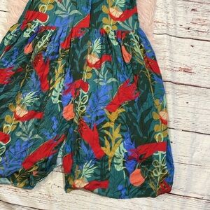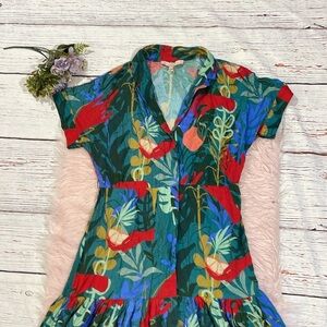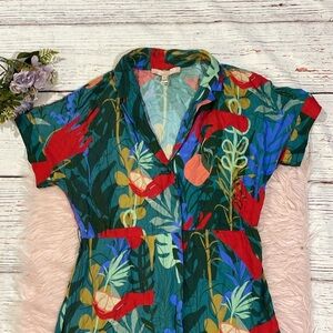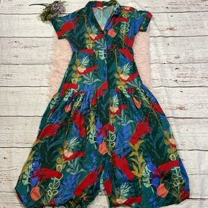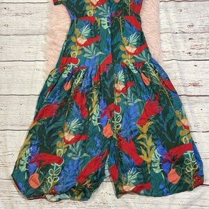 Vibrant tropical print. Features a wrap style. Short sleeves. Perfect for summer.