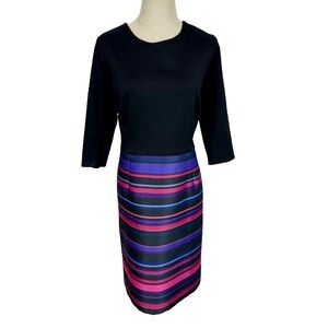 Black Ponte top with 3/4 sleeves and a v back. Skirt is a striped taffeta type fabric. Side pockets.