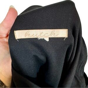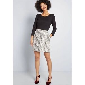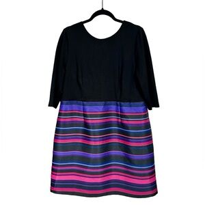 Black Ponte top with 3/4 sleeves and a v back. Skirt is a striped taffeta type fabric. Side pockets.