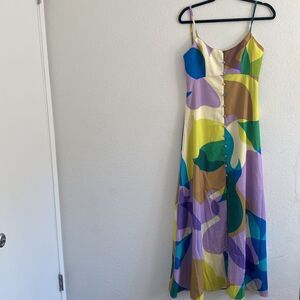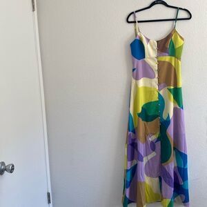 Details: colorful abstract pattern on this elegant maxi dress, tiny covered buttons down the front.