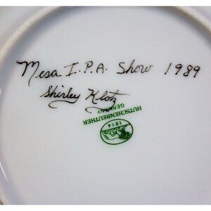 This set includes two Hutschenreuther miniature plates featuring a Southwest pottery design. Plates are signed Mesa I.P.A. Show 1989 Shirley Klotz and Francis Jackson. Each plate measures 3.75 inches in diameter and makes a great collectible or decorative piece.